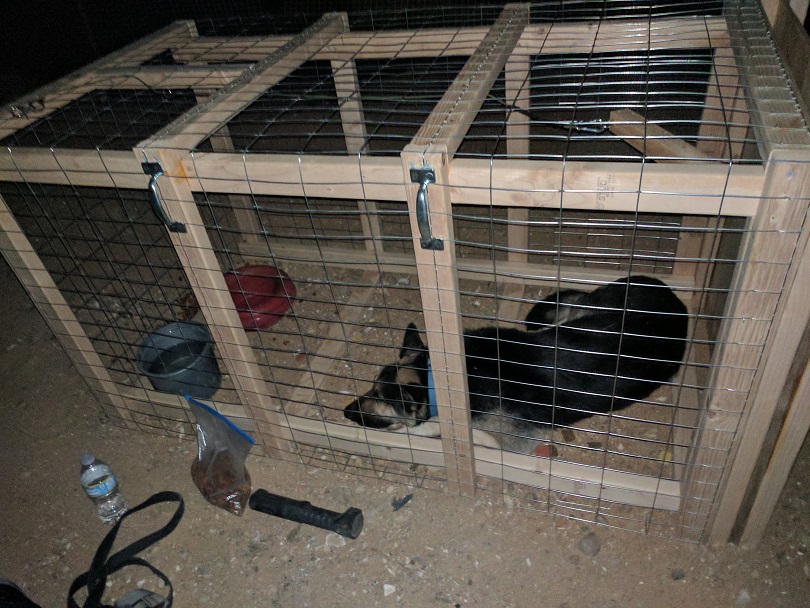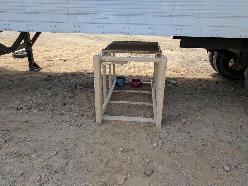 I placed a bowl of kibble, a gallon of water, and put a can of fresh tuna out on a plate to allure Paco to the